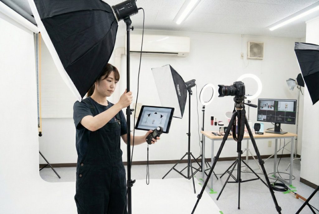 「商品をもっときれいに撮影したいけど、自宅の照明では限界がある…」「SNS用の写真をプロのように撮りたいけど、カメラの設定が難しい…」 そんな悩みを持っている方は多いのではないでしょうか。実は、物撮り撮影の成功は「撮影技術」よりも「環境」が9割を占めます。私自身も、自宅で商品を撮影していた頃は、どうしても影が入ってしまったり、色が実物と異なって見えたりと、何度も何度も撮り直していました。 しかし、大阪・西中島にある撮影スタジオを初めて利用した時、その問題がすべて解決しました。照明が整っている、背景が選べる、自然光も活用できる——こうした環境が揃うだけで、撮影の手間は劇的に減り、写真の質は飛躍的に向上したのです。 🎯 初心者がレンタル撮影スタジオを選ぶべき理由 物撮りスタジオを利用すべき理由は、シンプルです。「良い環境で撮影すれば、誰でもプロのような写真が撮れる」からです。 大阪のレンタルフォトスタジオは、商品撮影に必要なすべての要素を備えています。背景紙、照明機材、自然光を生かした窓、そしてライブ配信対応のWi-Fi環境。これらが完備されていれば、初心者でも確実に品質の高い写真が撮影できるのです。 特に西中島南方駅周辺のレンタルスタジオは、梅田からのアクセスも良く、新大阪方面からも利用しやすい位置にあります。仕事帰りや休日に気軽に利用できることも大きなメリットです。 📸 物撮りスタジオで撮影をする前に確認すべきポイント 撮影スタジオを選ぶ際、初心者が見落としがちなポイントをご紹介します。 1. 背景紙の種類が豊富か 物撮りの印象は、背景で大きく左右されます。白い背景で撮影すれば、商品が際立ちますし、グレーの背景なら落ち着いた雰囲気を演出できます。白ホリゾント(白い無限背景)は特に、アパレルやコスメの撮影に適しています。 西中島の撮影スタジオでは、複数の背景紙が用意されているため、撮影する商品の種類に合わせて選択できます。これは自宅では難しい大きな利点です。 2. 照明の質と数 照明こそが、撮影の質を決める最大要因です。良いスタジオには、メインライト(主光源)、サブライト(補助光)、バックライト(背景の奥行き表現)が複数配置されています。 例えば、アクセサリーを撮影する際、正面からのメインライトで形を捉え、側面からのサブライトで質感を表現し、背後からのバックライトで